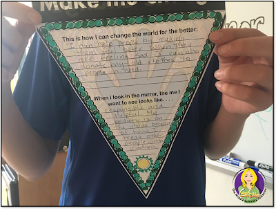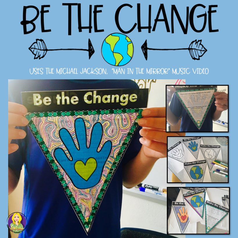 I then had them listen to the song and we talked about what it meant. Once they were done, I asked them to color a pennant to show their commitment to helping to make the world a better place. Once they are finished, we hung them around the school. Seeing the pennants around the classroom is a great reminder for my students. Be the Change – Make the Change!