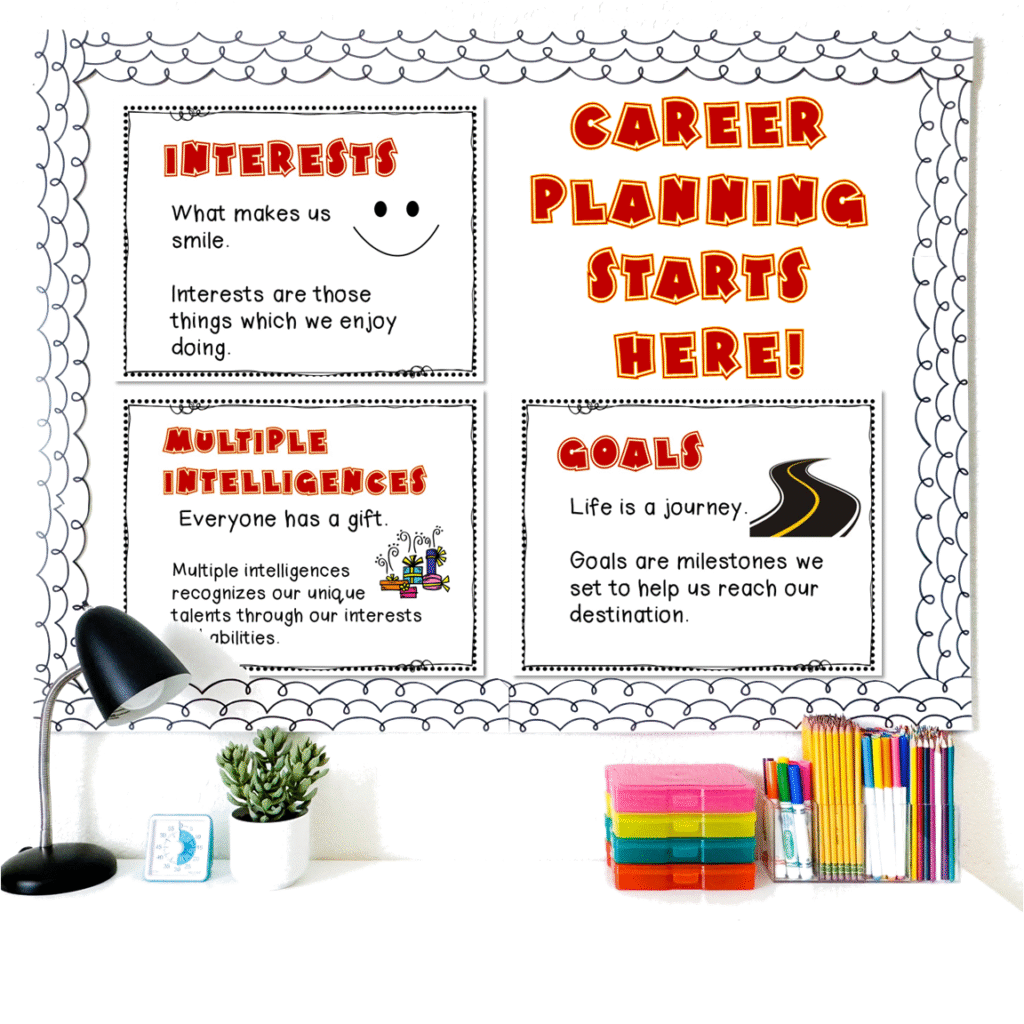 Our 7th grade students recently completed an interest survey. I went into classes and discussed goals, interests, and multiple intelligence. I started the conversation by asking them to define each of the 3 words. Here are the posters: