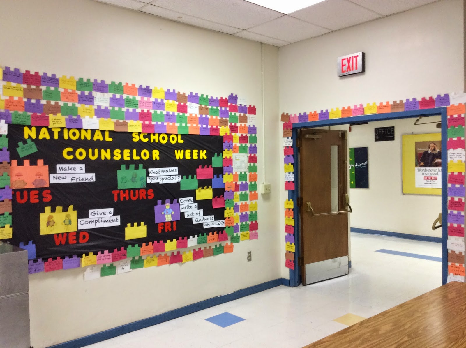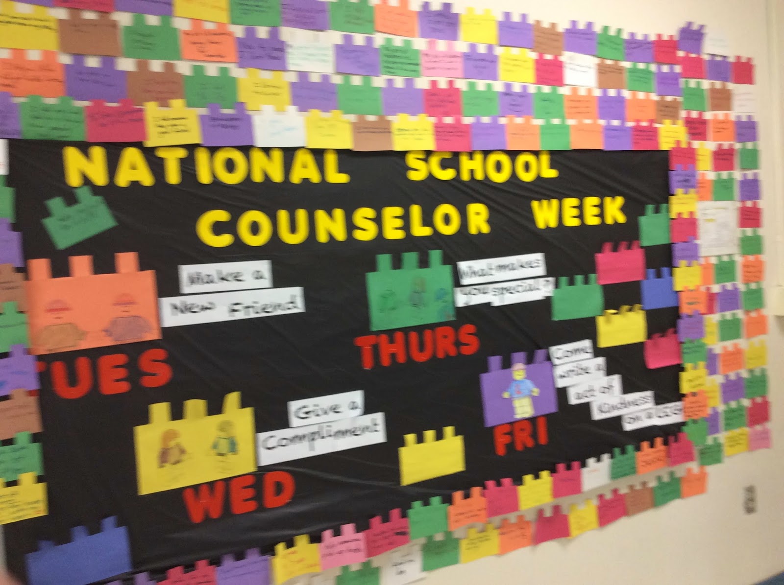 Today was a fun day. I spent four lunch periods in the cafeteria. To keep with the Lego theme, my intern, Sarah, cut 300+ paper legos for the kids to write on. We asked each student to write one act of kindness they preformed on their lego and then we posted it around the bulletin board that Sarah made earlier this week.