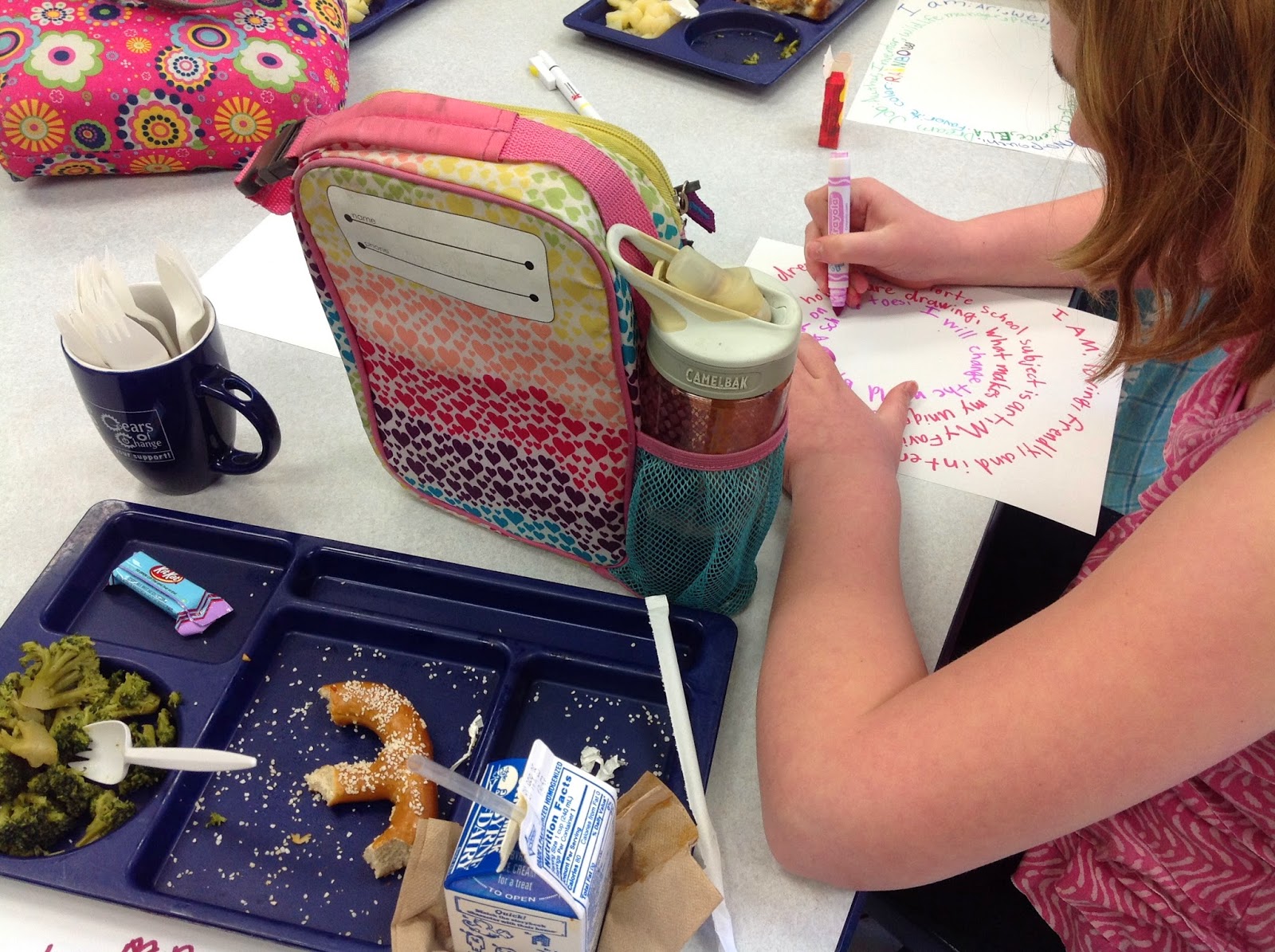 Yesterday I told you all about the BYOU magazine (including a chance to win a 1 year subscription). Today I want to show you a lesson idea that I got from reading the magazine. I asked the girls to think about themselves, what they loved, and what makes them who they are. We grabbed some paper and markers and wrote the answers in a spiral until we got to the middle of the paper. I then asked them to draw a symbol in the center that summed them up. I started mine on the board.