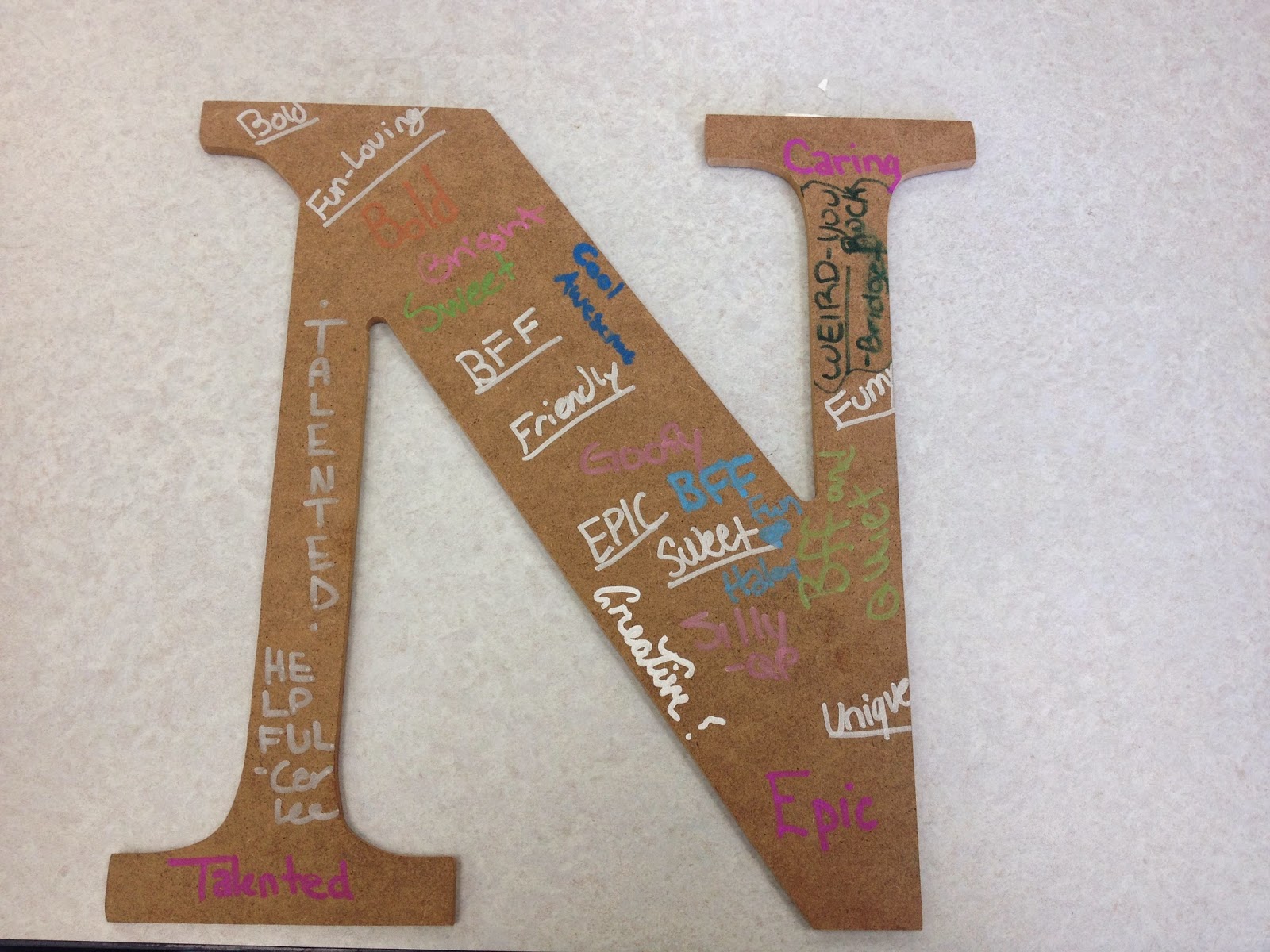 The initials were all spread out on my table.  As the kids came in I handed out their initials and had them take a pen or marker.  They ate quickly and  I asked them to write words they thought described each of their new friends on their friends’ initials.