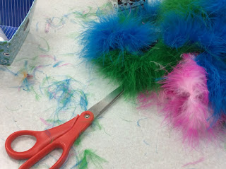 For the hair, I used feather boas, which I cut into smaller pieces. Just one word of caution–do this after everyone is done eating, especially if it is spaghetti day. Feathers were everywhere!!!!