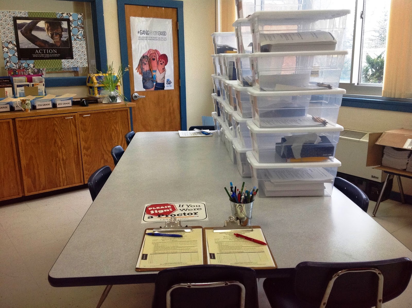 NYS ELA testing for grades 3-8 has begun. I updated my signs for testing in progress and copies one I saw on Pinterest. I enclosed it with our testing supplies. In each of the boxes are tests, answers sheets, directions, roster, and a proctoring duties form. They also contain extra sharpened pencils and tissues. Each box has the teacher’s name, room number and is color coded by grade level. Teachers love the organization and they are quick and easy to grab first thing in the morning. (You can look at this post from last year to see the forms that go into each box.)