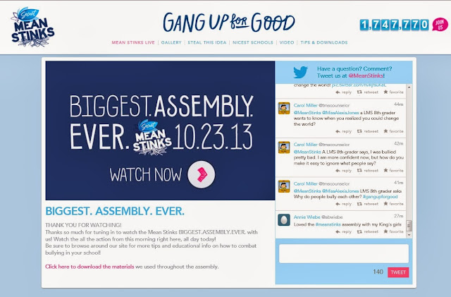 With some help from the Tech Department, several teachers, our principal, and friends, we were able to pull this off. The cool part of all of this is that you can log onto www.meanstinks.com and watch the live version. You can also register your school (although it will fall under high school) as the Nicest School In America. You can tweet all the great things you and your kids are doing to #gangupforgood and you will be able to see all the great things under your school. Check out Lansing High School (zip code 14882) and see all our tweets and what our kids asked and had to say. For our middle school students, we did not allow cell phones in the assembly. I did have index cards available and students could post their tweet on the card and hand it to one of our “Tweeters” and it was sent that way. We also had Treats for Tweets, and anyone who asked a question or handed in a comment got a little goodie bag. The kids were very excited!