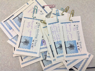It was under $15 by the time I used a 50% coupon and my teacher ID card. It is a ficus tree. I chose it because it wasn’t evergreen, and did not look like a Christmas tree. It does, however, look like the apple tree from Shel Silverstein’s book. It is proudly displayed in my office for everyone to see. Kids often ask, “who are the presents for” and I explain the program. Sometime, I even have a few kids call parents and ask if they can take a tag home. (To see how I put our program together and printouts for tags and shopping sheets click here.)