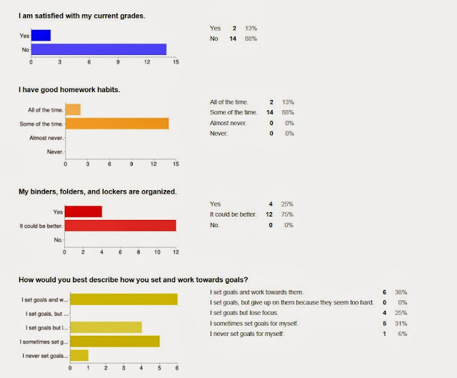 I put together this pretest in Google Drive. I wanted to find out what students thought about their work habits and how satisfied they are feeling with their current grades. To give some background information, the students I targeted are failing two or more classes.