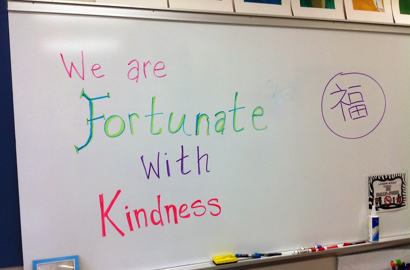 As they entered my room, I had this written on the White Board. My secretary Kimmie, who is originally from Japan, wrote in Japanese the word “fortune” on the board as well. As the kids ate their lunch we talked about how we are all fortunate with all kinds of kindness. I will say with 5th graders you really never know what they are going to say, and sometimes, I can’t help but laugh hysterically right along with them. When I asked what is something kind that they could do, I got answer that included, “Help someone”, “Tell someone they are pretty” and my favorite, (but definitely the wrong answer) “kiss boys”.
