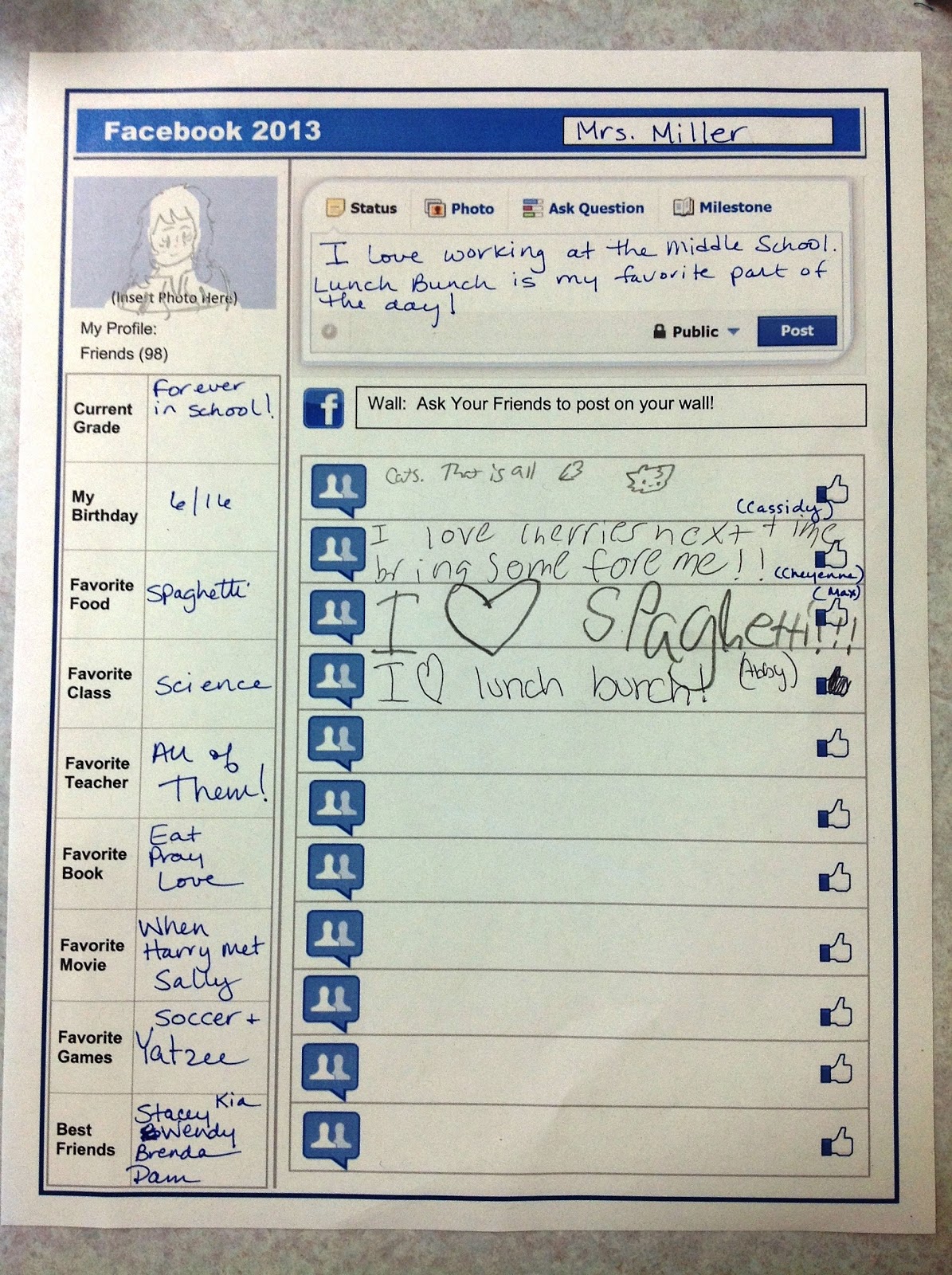 After each student wrote in their favorites and added their status update, we sent the sheets around the room for other LBers to write a positive message to the friend’s page who was in front of them. Although most of my LBers do not have a Facebook account, they were excited to have their own page.
