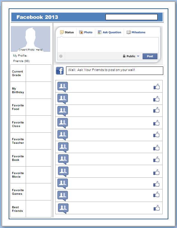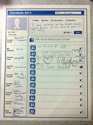 There are spots for each student to write their current favorites, give their status update (I asked them for their favorite event of the past year or a quote that would summarize their year) and friend updates.