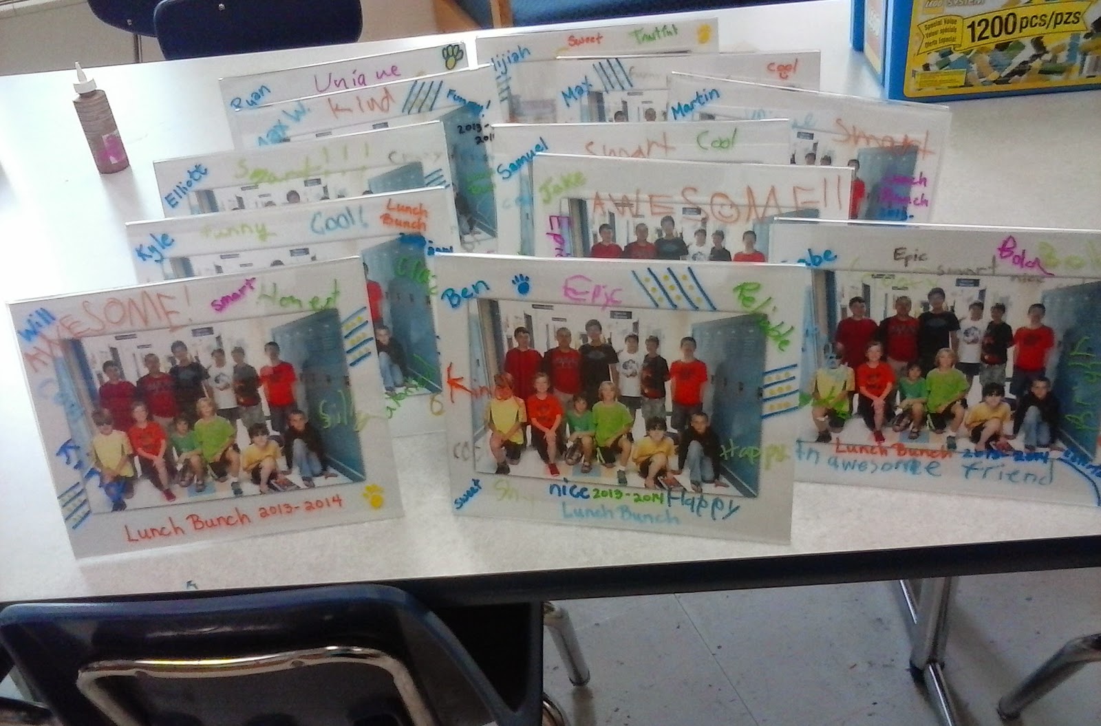 Today was the boy’s turn to say goodbye and complete their final project. I used the same words on my whiteboard as I used with the girls, but instead of writing descriptive words on initials, we wrote them on picture frames. (Click on the links to see the pictures and post about the last Lunch Bunch with my girls.)